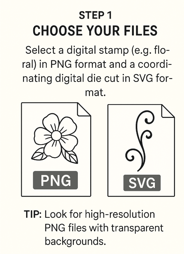 Action: Select a digital stamp (like a floral motif or scripted sentiment) in PNG format and a coordinating digital die cut in SVG format.